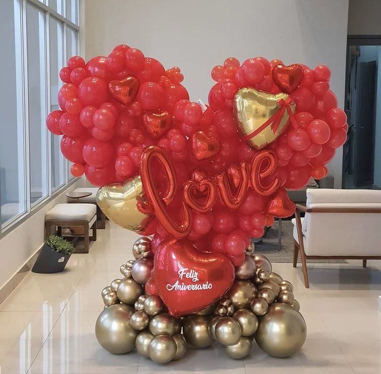 Εντυπωσιακή διακόσμηση μπαλονιών σε σχήμα καρδιάς, ιδανική για την Ημέρα του Αγίου Βαλεντίνου, ρομαντικές εκδηλώσεις και ξεχωριστές στιγμές.